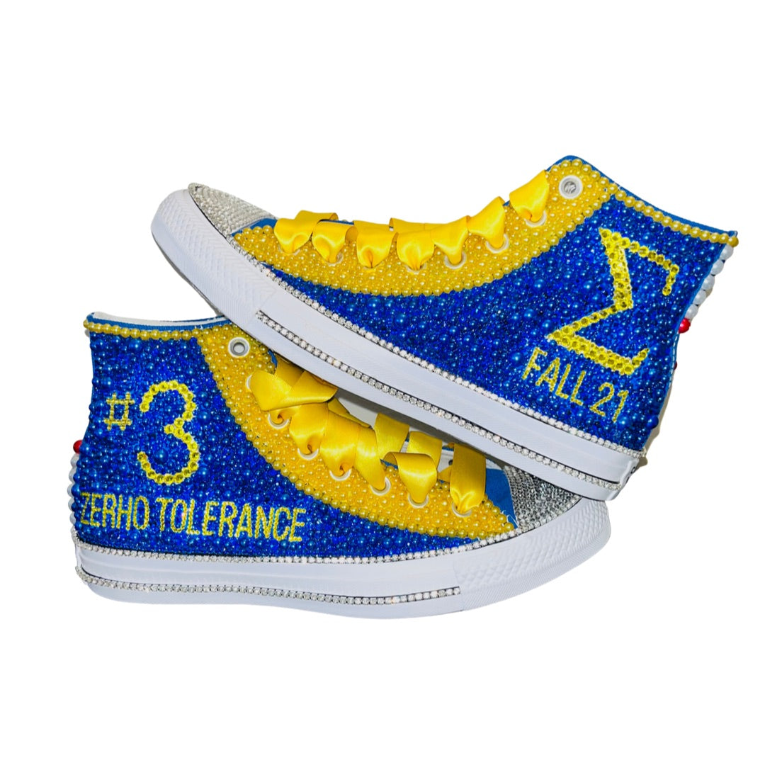 Fully bedazzled canvas sneakers with thousands of rhinestones and pearls. Customized with your information, each pair is a work of art.