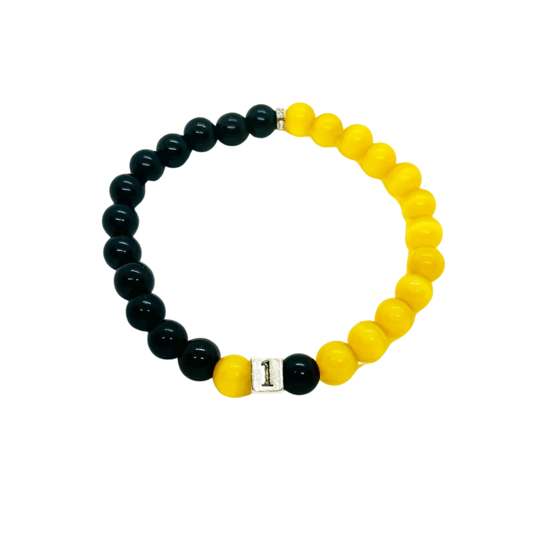 Alpha Frat charm bracelet with line position charm. Display your fraternity’s colors brightly and beautifully with this hand stung, bead charm bracelet. A perfect, affordable gift for new members or as a gift for your favorite Alpha Man on his Founder’s Day, crossing anniversary, birthday or just because! The bracelet is constructed on super stretchy, yet durable elastic string that rests comfortably on wrists without irritation.