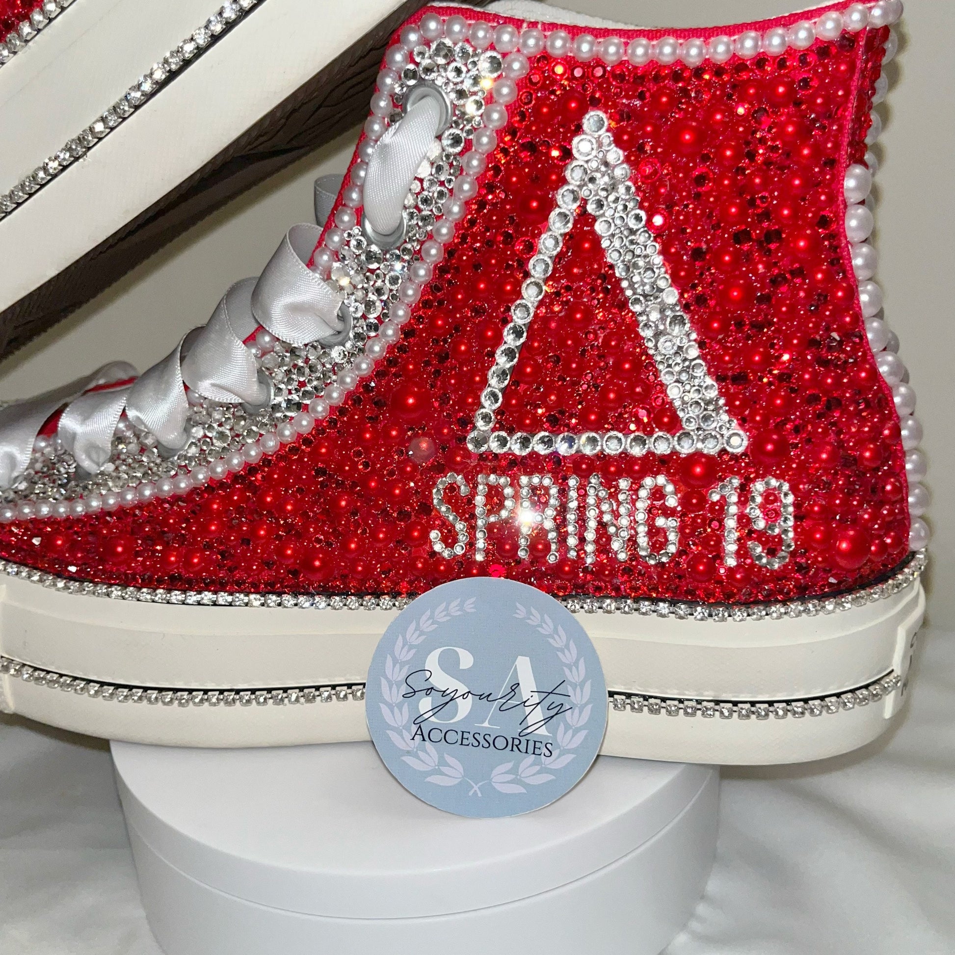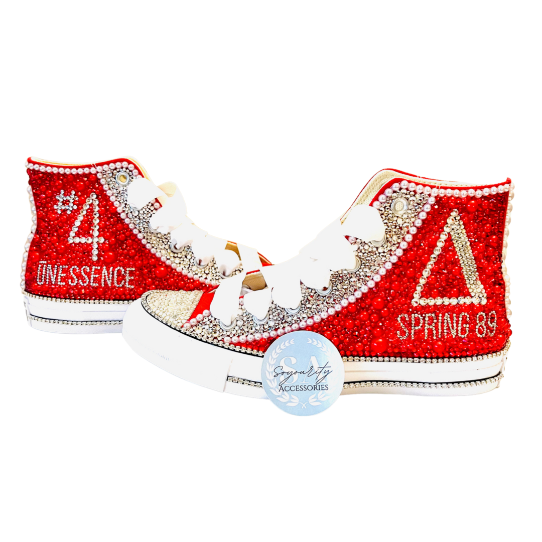 Beautiful and blinged out custom canvas shoes. Each shoe has thousands of faceted rhinestones and flat back pearls. Add your line name, chapter, letters, or whatever else to your shoes for a personalized touch. Back of shoe includes 22 pearls representing the 22 founders.