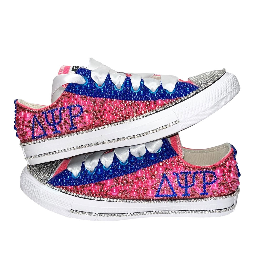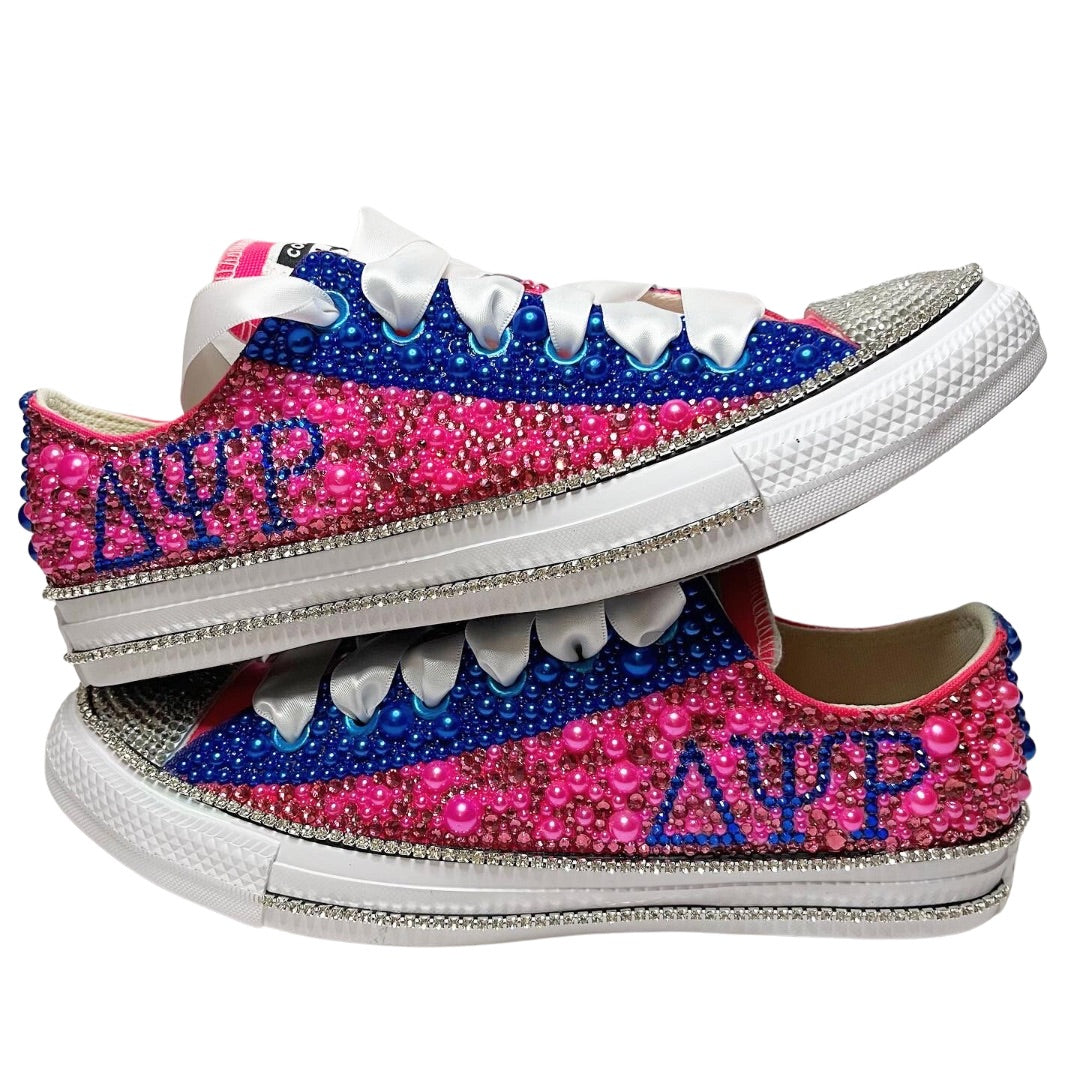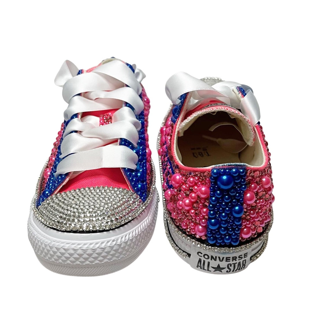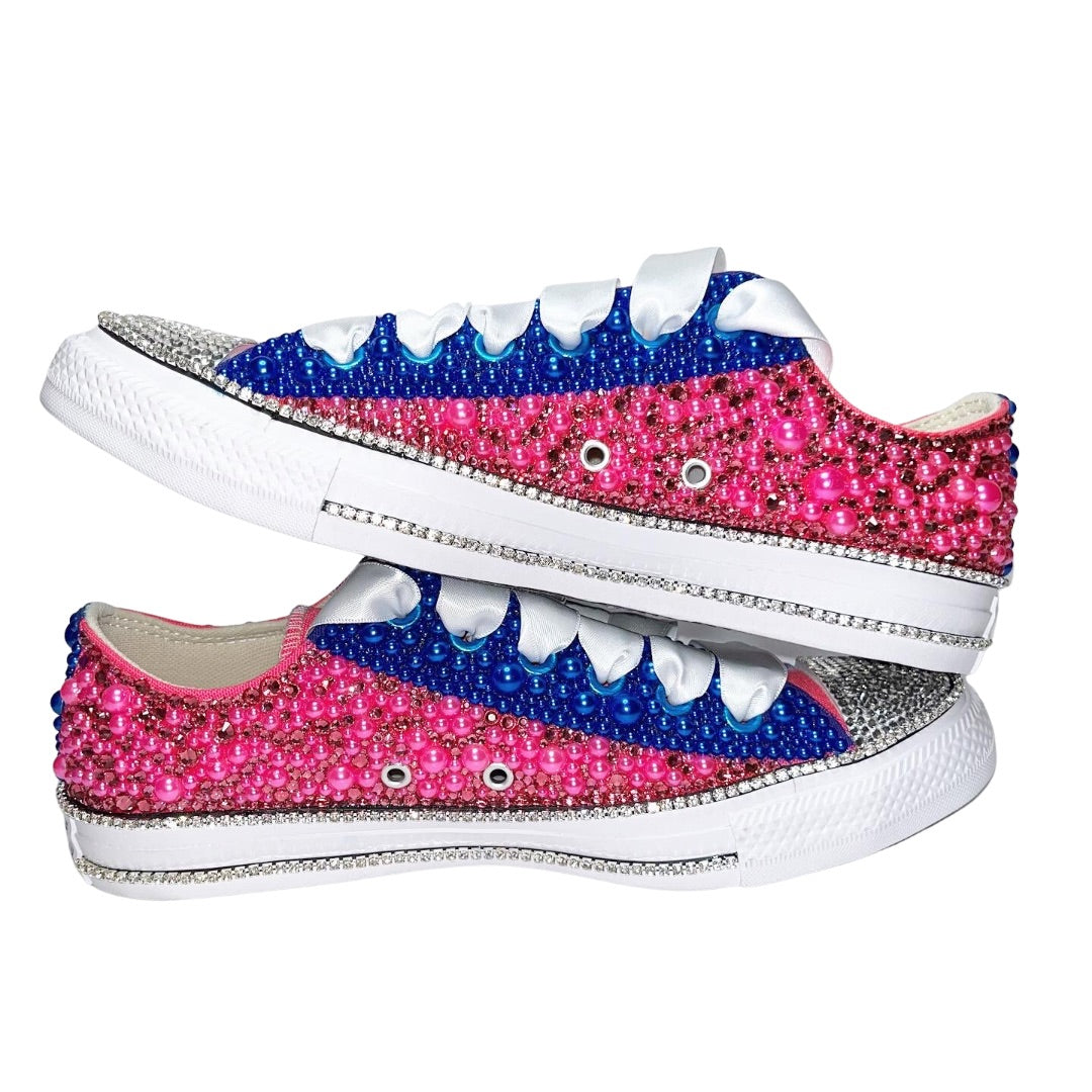 Beautiful and blinged out custom canvas shoes. Each shoe has thousands of faceted rhinestones and flat back pearls.