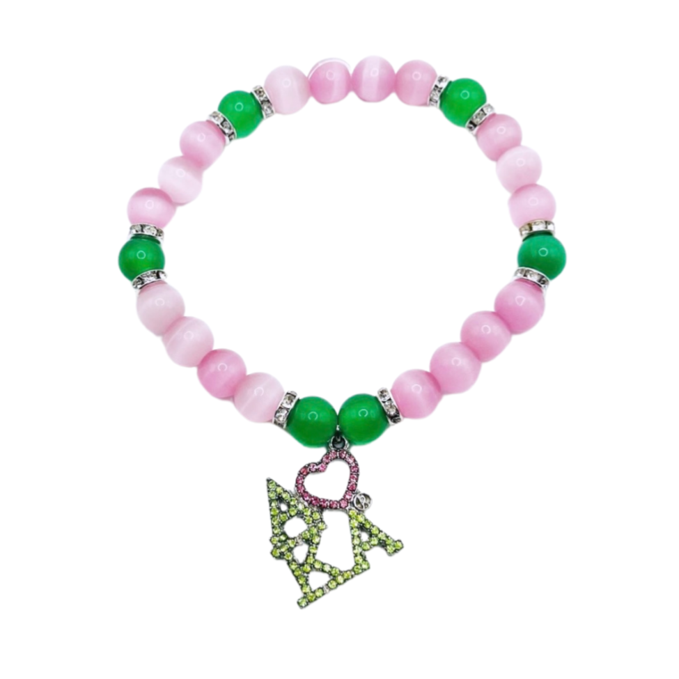 Beautiful pink & green bracelet with love charm in the middle. A perfect, affordable gift for new members or as a gift for your favorite soror on her Founder’s Day, crossing anniversary, birthday or just because! The bracelet is constructed on super stretchy, yet durable elastic string that rests comfortably on wrists without irritation.