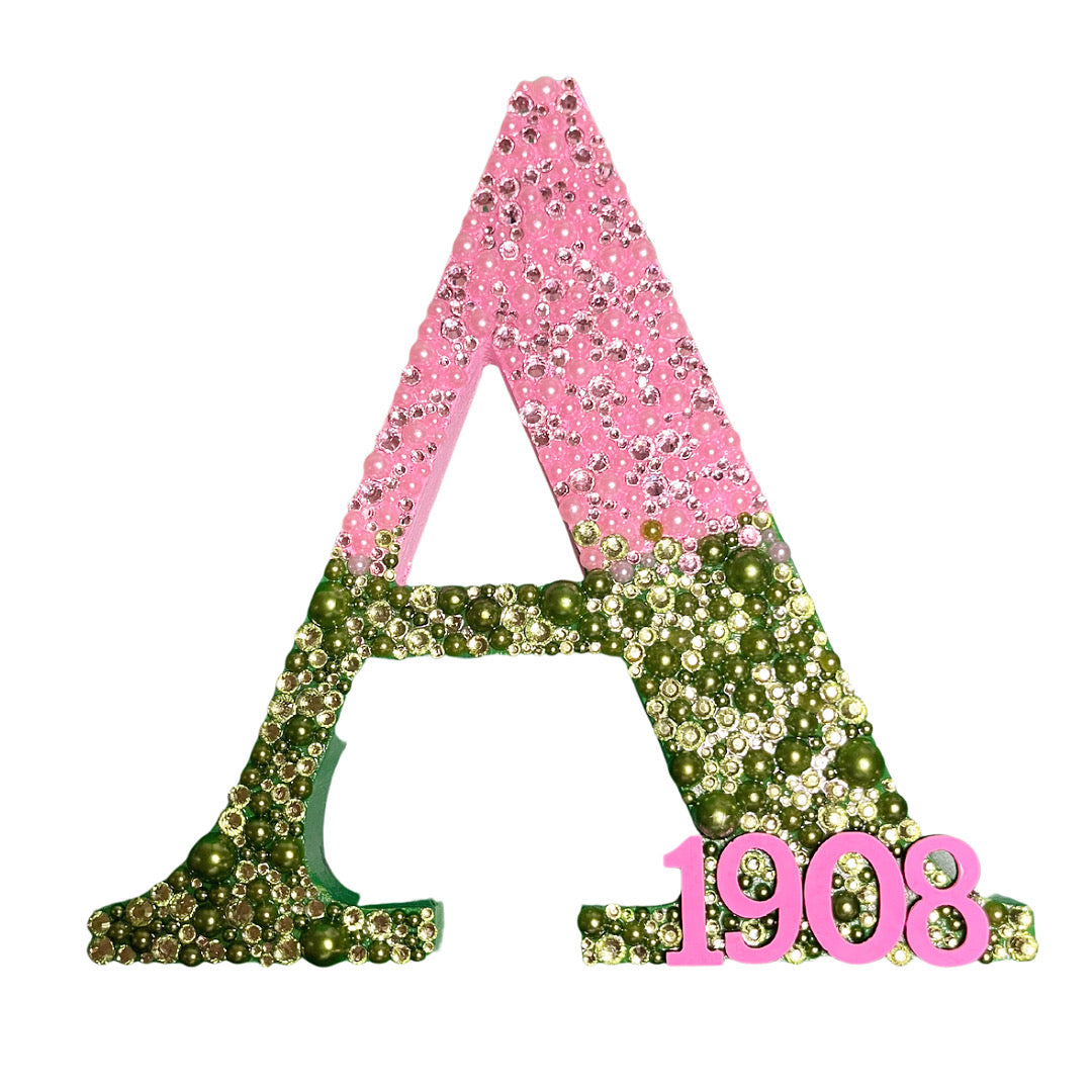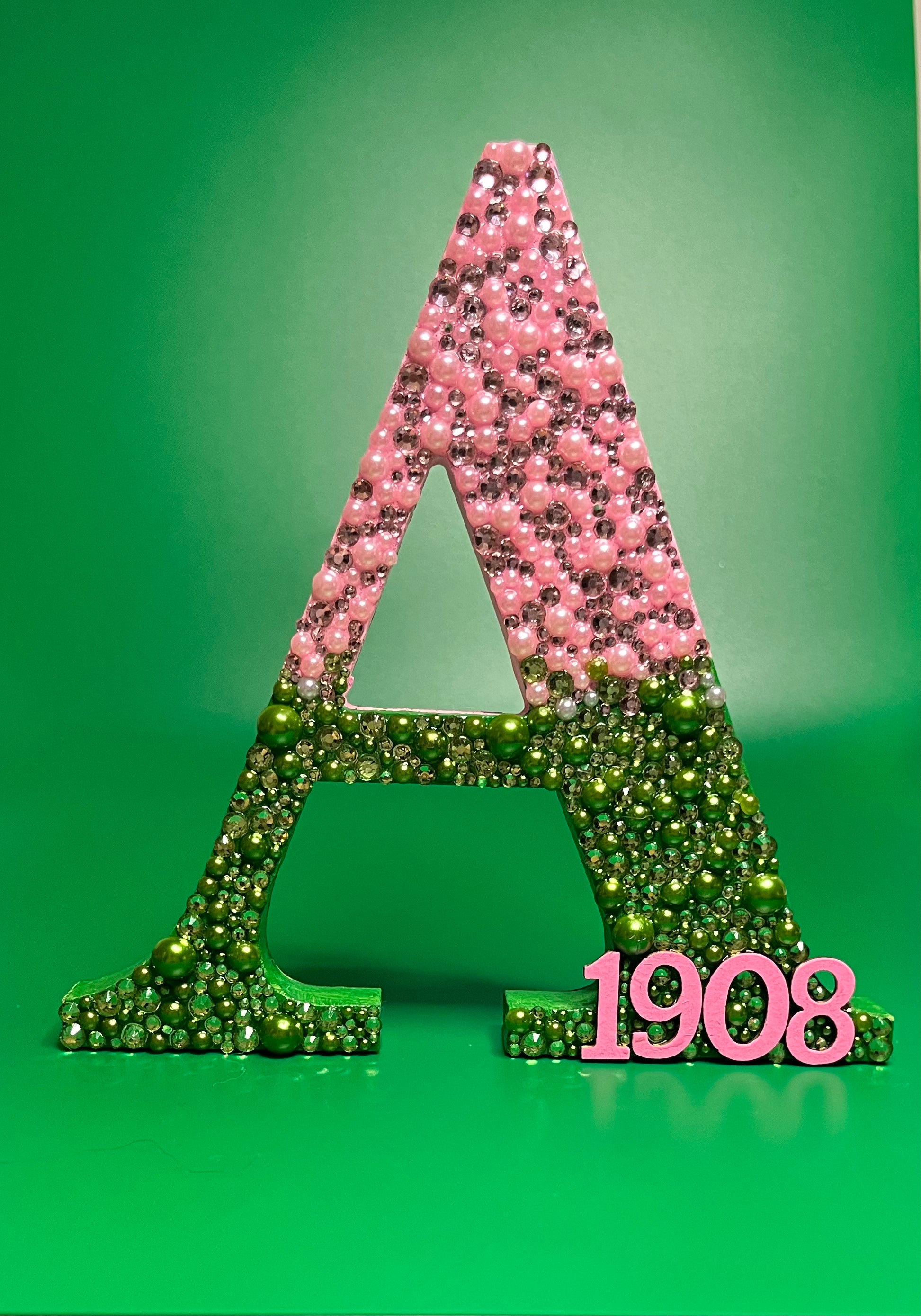 pink & green rhinestone & pearl covered standing decorative wooden A
