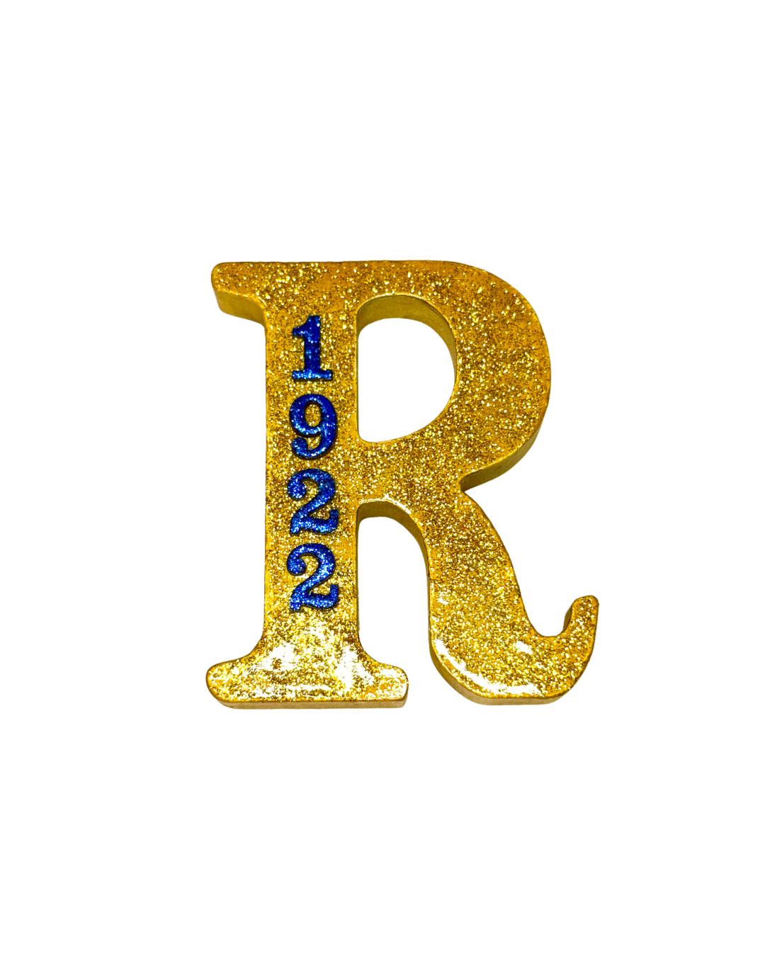 4.5 inch self standing letter initial with sorority founding year. All orgs available and letters in stock. Topped with glitter. Bulk rates available, send a message for details