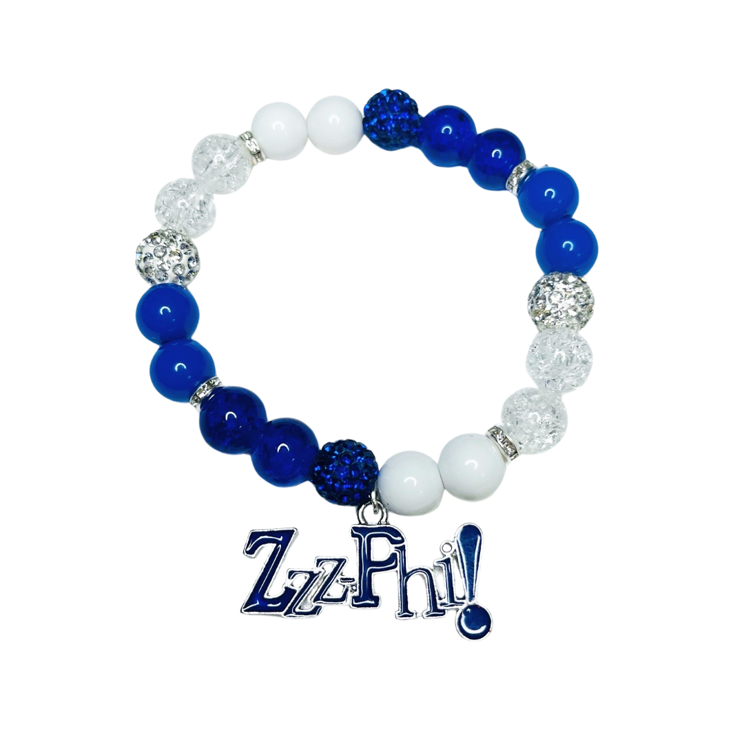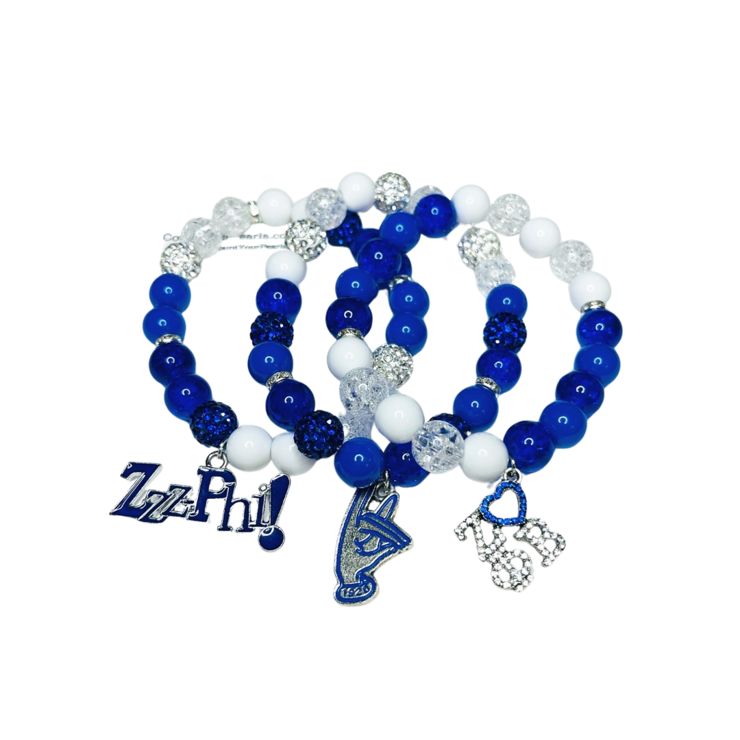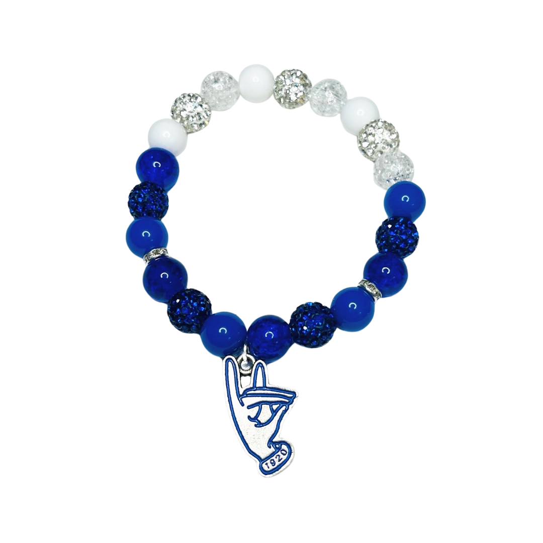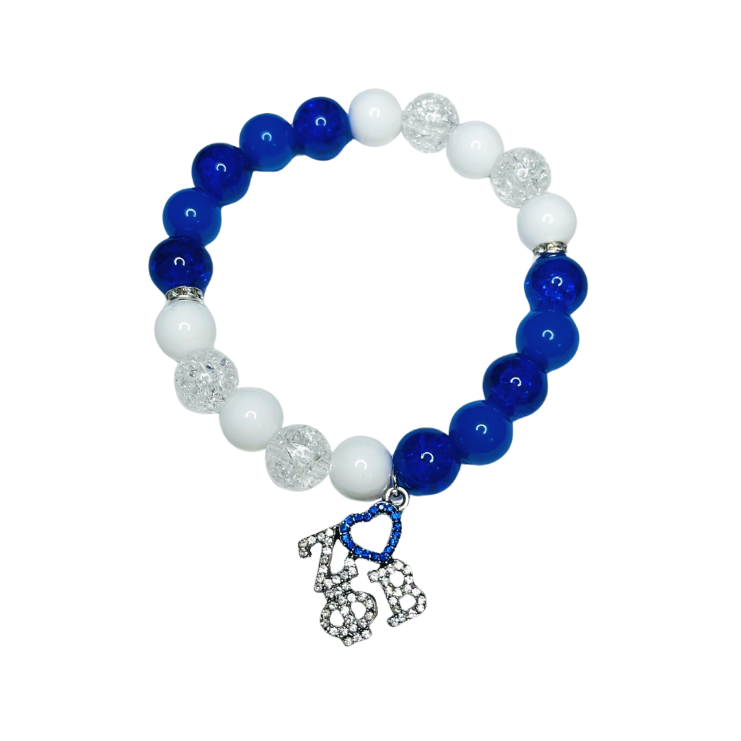A colorblock combination of blue and white beads with a sorority themed charm.